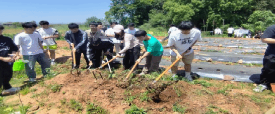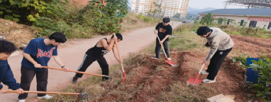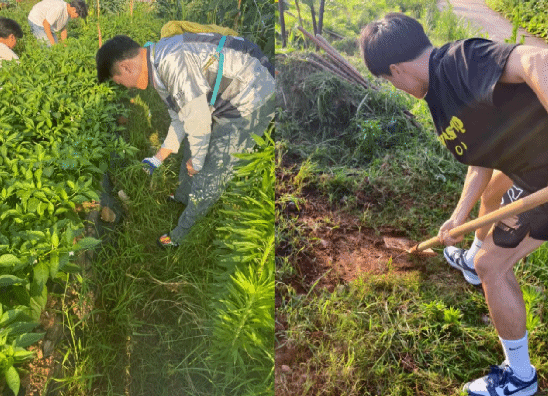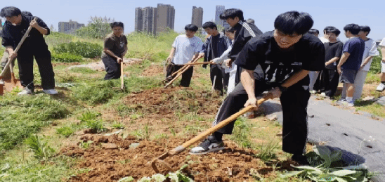 开耕首日阳光特别烈,我们分组拿着铁锹、镰刀清理障碍物。我作为有农作经验的代表负责带领同学们走在前面,教他们辨识杂草种类、传授除草技巧,还强调“除草务必彻底,连根拔除”。我和同学们蹲在地里一点点挖草根,不一会儿汗水就顺着额头往下流,浸湿了衣衫,泥土也沾满了裤脚。可当看到原本杂乱的土地渐渐显露出雏形,我的心里满是成就感。